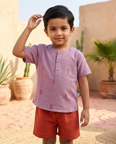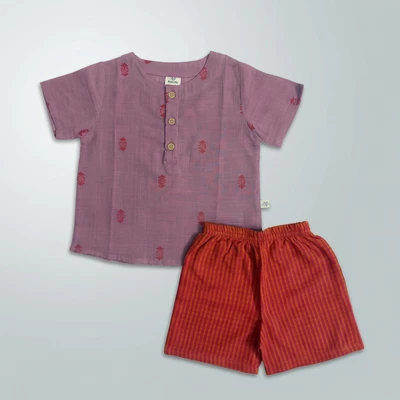 Mul Mul top and bottom set is the perfect blend of style and comfort. Featuring a mandarin collar, half sleeves, and vibrant ethnic print, the shirt is made with soft and breathable Mulmul fabric. The matching solid cotton shorts complete the look with a concealed elasticated waistband for a comfortable fit, creating an effortless outfit that's perfect for any occasion.