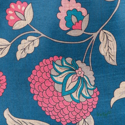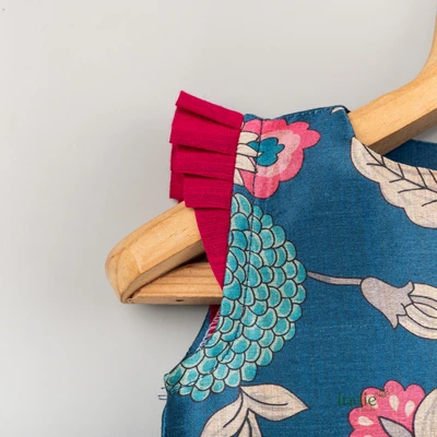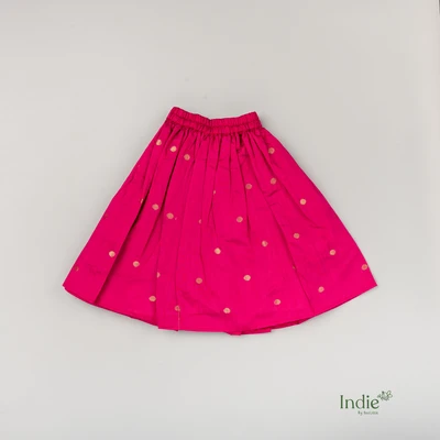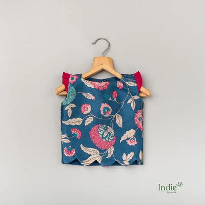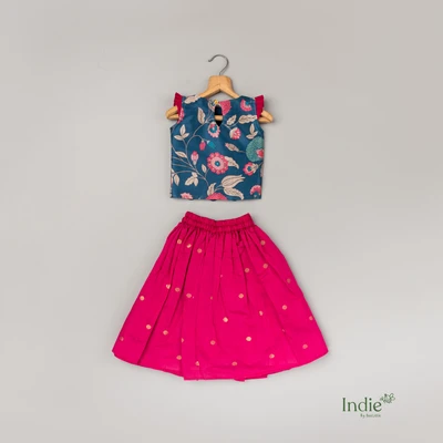 Blue And Pink Raw Silk Scalloped Top And Skirt