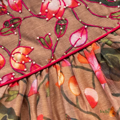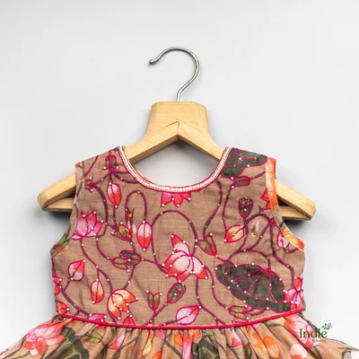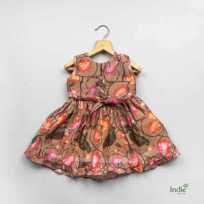Brown Lotus Printed Bottom Ruffle Dress With Tie- Back