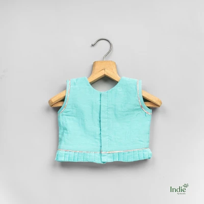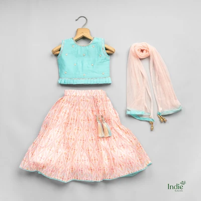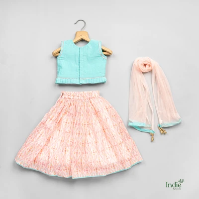 Pink Floral Printed Top And Blue Pleated Lehanga
