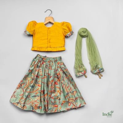 Olive Green Puff Sleeve Top And Pleated Lehenga With Dupatta