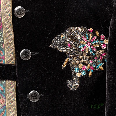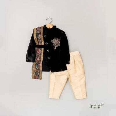 Colourful Floral Elephant Embroidered With Black Kurta And Beigh Pant With Floral Printed Dupatta