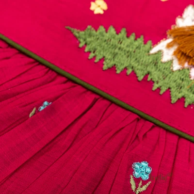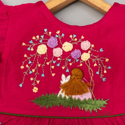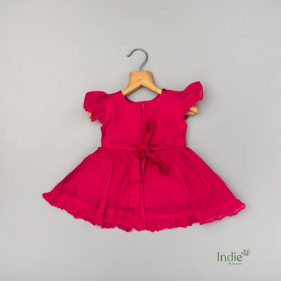 Dark Pink Floral Girl Emberoided Cap Sleeve Tie Up Frock