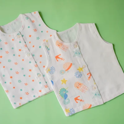 Sleeveless jabla fabricated in pure muslin cotton & outlined in round neckline. The bodice of the jabla is enclosed with straight button placket. This soft and fine weave of cotton fits great for your baby and keeps them at ease.