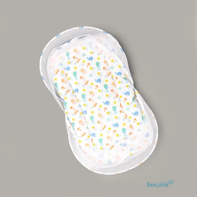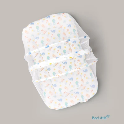 Newborn sleeping mattress with mosquito net is made from cotton material and stuffed with anti-allergenic polyfiber filling. Easy double zipper to build-up the net with two arched frame for support that holds the net wide and to keep it down when required.