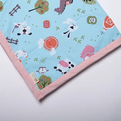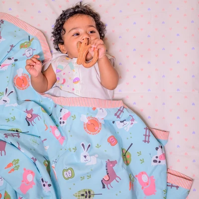 Dual layered blanket in soft woven pure cotton, has quirky and adventurous all over prints. Light-weight blankets comes in a folded trim and multi stacked inner that perfectly insulates temperature.
