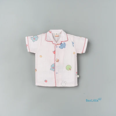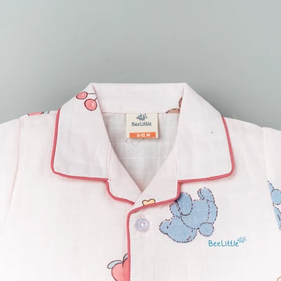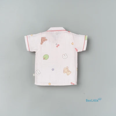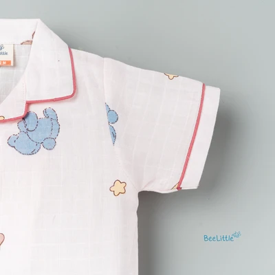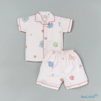 Our Pyjama sets offer comfort and style for your little one's restful night's sleep. Each set includes a short-sleeve button-up top with a classic collar and chest pocket, finished with contrasting piping. The matching pants feature an elastic waistband and piped cuffs. Made from soft, breathable fabric, they are gentle on baby's skin and are perfect for year-round wear.