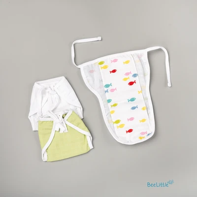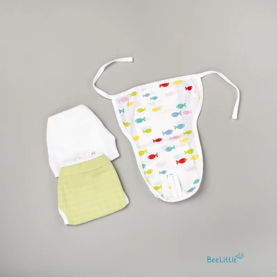 Pack of three newborn reusable muslin nappies. Couple of loops stay upfront, whilst the wide area is edged with tie-ups. Finley sewn side seams, prevents young infants from rashes and skin irritations.