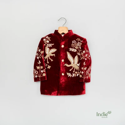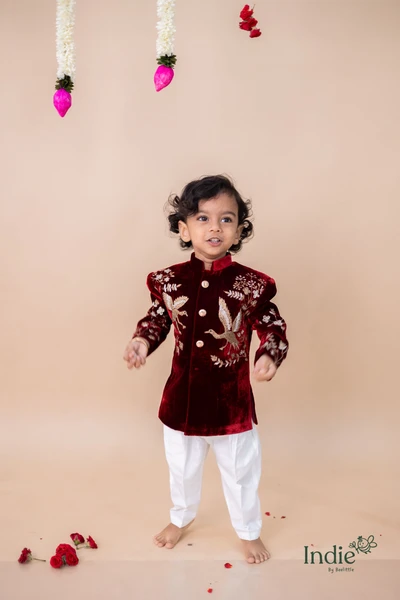 White Peacock Embroidered Red Velvet Kurta With Beige Pant