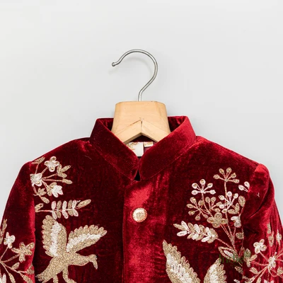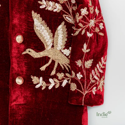 Golden Bird Embroidered Red Velvet Kurta With Beige Pant