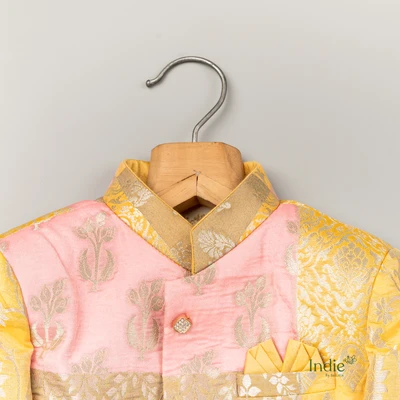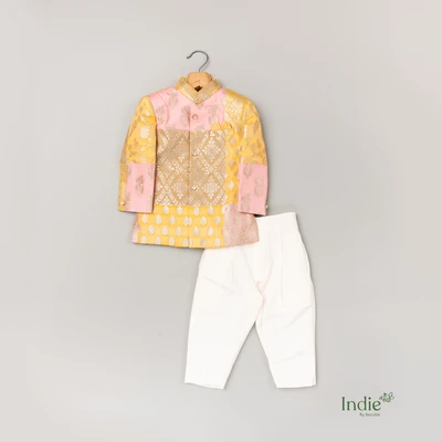 Golden Zari Printed With Gold And Pink Patched Kurta And White Pant