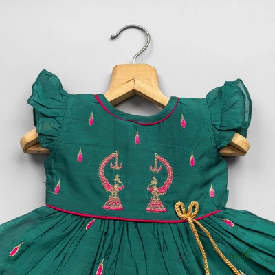 Green Cap Sleeve Embroidered Dress With Tie-Back