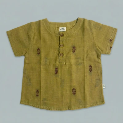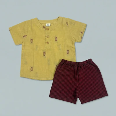 Mul Mul top and bottom set is the perfect blend of style and comfort. Featuring a mandarin collar, half sleeves, and vibrant ethnic print, the shirt is made with soft and breathable Mulmul fabric. The matching solid cotton shorts complete the look with a concealed elasticated waistband for a comfortable fit, creating an effortless outfit that's perfect for any occasion.