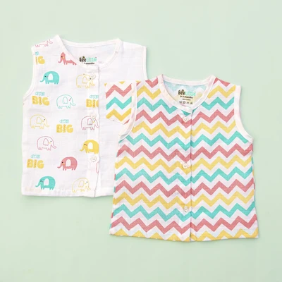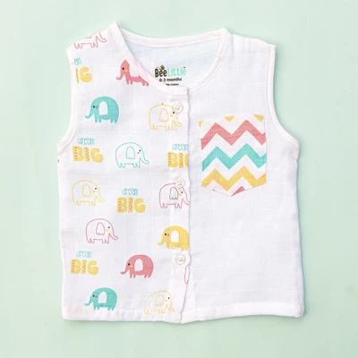 Sleeveless jabla fabricated in pure muslin cotton & outlined in round neckline. The bodice of the jabla is enclosed with straight button placket. This soft and fine weave of cotton fits great for your baby and keeps them at ease.