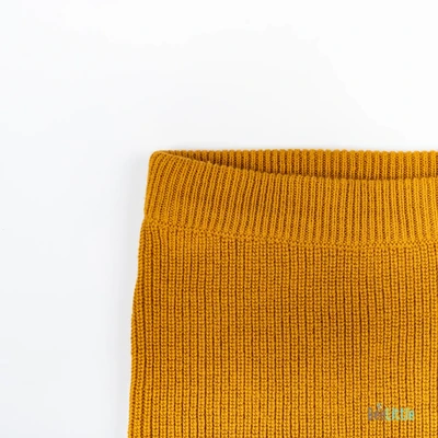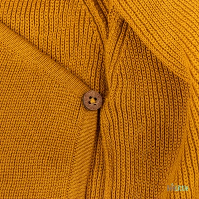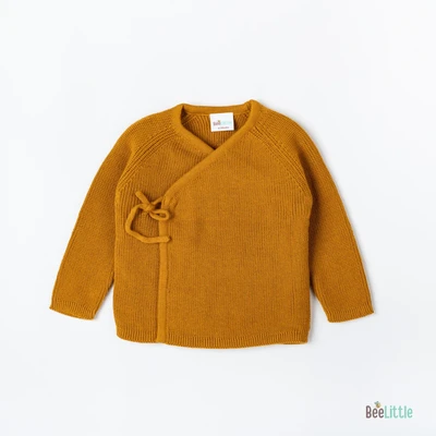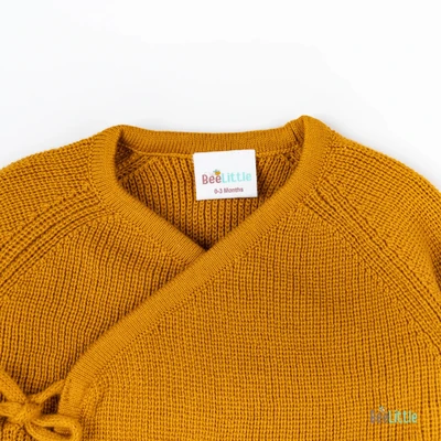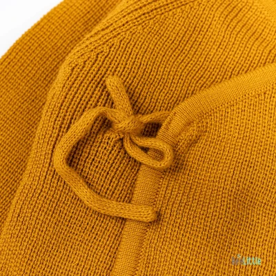 Organic warmer set consists of a sweater and pants. Knitted sweater in ribbed waist hem, round rib crew neck and long sleeves with cuffed trim. The kimono styled vest is secured with a tiny tie-up. Set up with knitted jogger style pants with waist elastication that can be slipped on.
