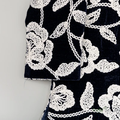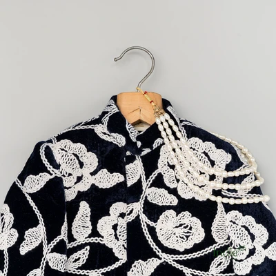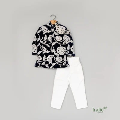 Navy Blue Kurta With White Floral Embroidery And Pearl Accents Paired With White Pant