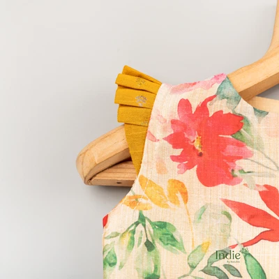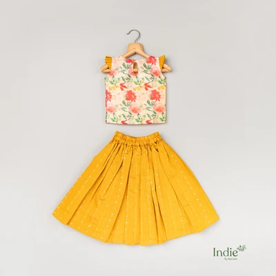 Off White And Mustard Raw Silk Scalloped Top And Skirt