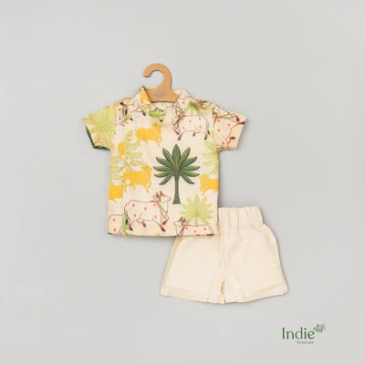 Off White Pichwai Side Placket Shirt And Shorts