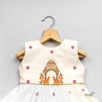 Offwhite Orange Elephant Embroidered Dress With Tie-Back