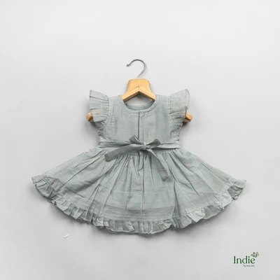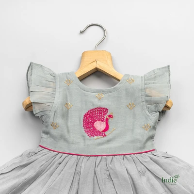 Pink Peacock Embroidered Grey Dress With Tie-Back