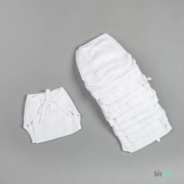 Pack of ten newborn reusable muslin nappies. Couple of loops stay upfront, whilst the wide area is edged with tie-ups. Finley sewn side seams, prevents young infants from rashes and skin irritations.