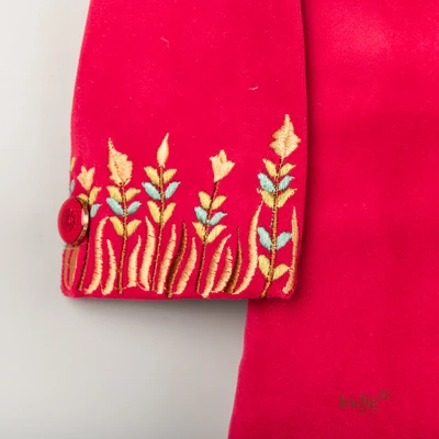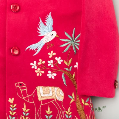 Golden Bird Embroidered Red Velvet Kurta With Beige Pant