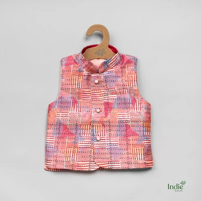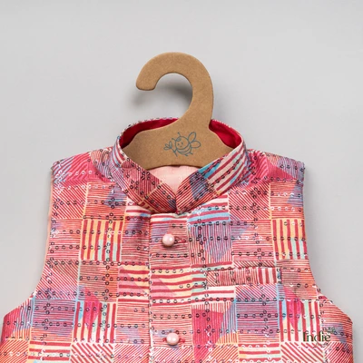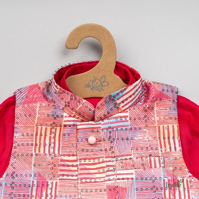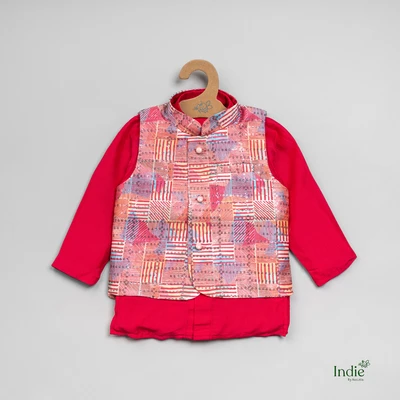 Red Kurta With Printed Jacket And Pant