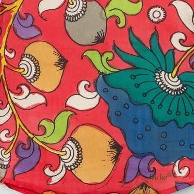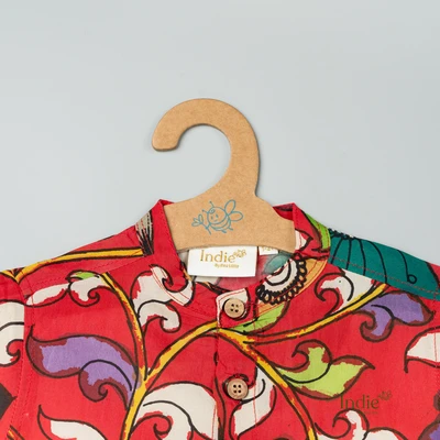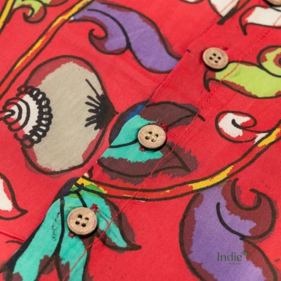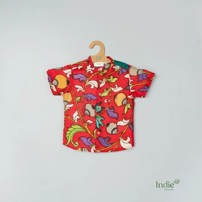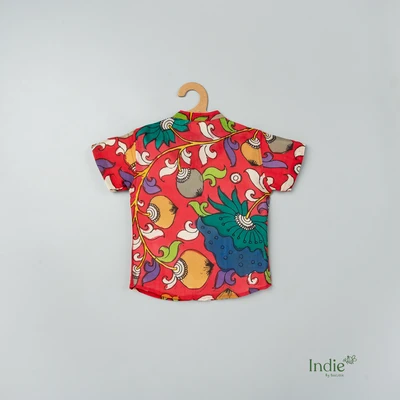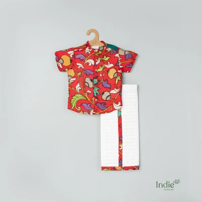 Red Swirl Kalamkari Shirt With Checked Dhoti Set