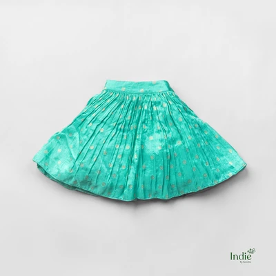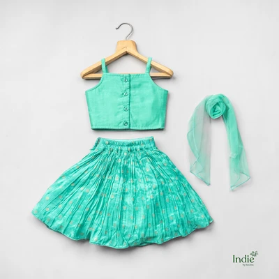 Golden Lace Printed Lime Green Crop Top And Skirt With Dupatta