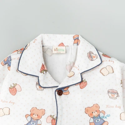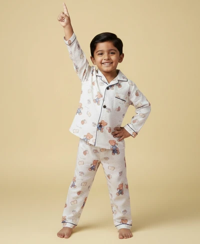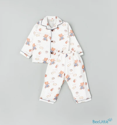 Our Pyjama sets offer comfort and style for your little one's restful night's sleep. Each set includes a short-sleeve button-up top with a classic collar and chest pocket, finished with contrasting piping. The matching pants feature an elastic waistband and piped cuffs. Made from soft, breathable fabric, they are gentle on baby's skin and are perfect for year-round wear.
