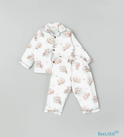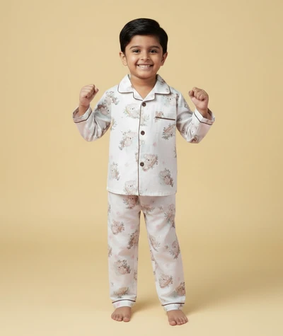 Our Pyjama sets offer comfort and style for your little one's restful night's sleep. Each set includes a short-sleeve button-up top with a classic collar and chest pocket, finished with contrasting piping. The matching pants feature an elastic waistband and piped cuffs. Made from soft, breathable fabric, they are gentle on baby's skin and are perfect for year-round wear.