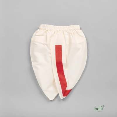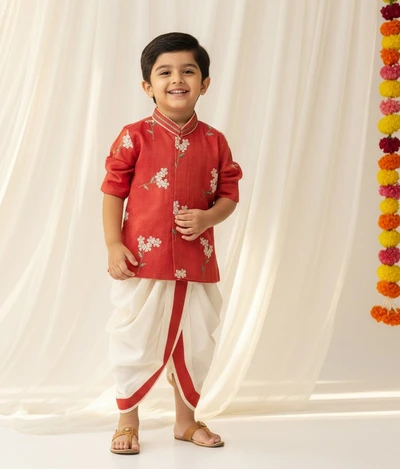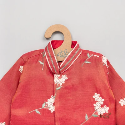 White Floral Embroidered Short Red Kurta With Dhoti