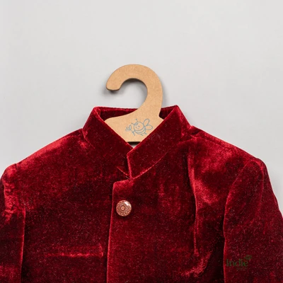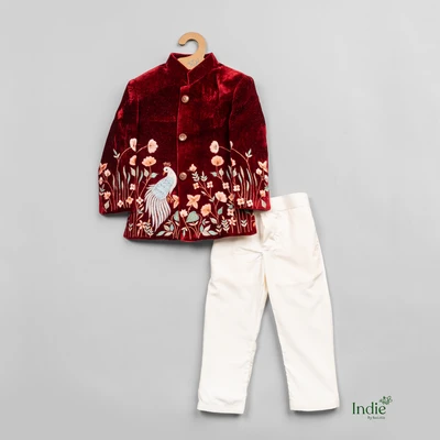 White Peacock Embroidered Red Velvet Kurta With Beige Pant