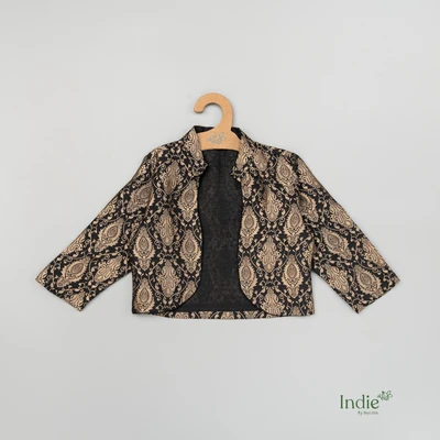 White Raw Silk Butta Dress With Black Brocade Coat