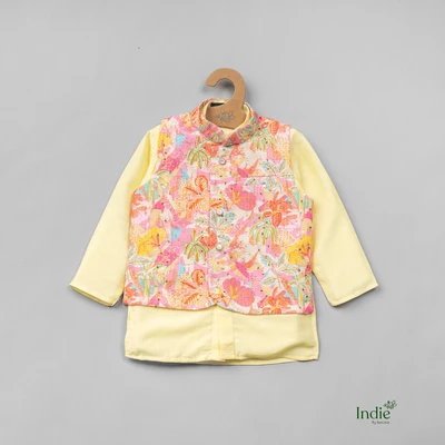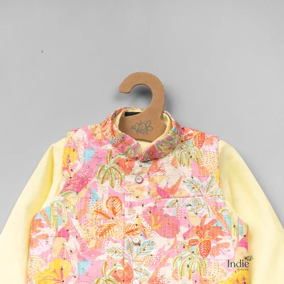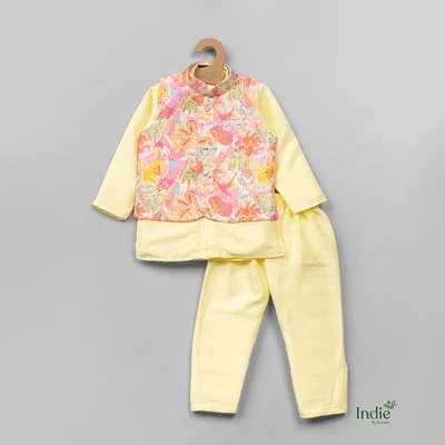 Yellow Kurta With Multifloral Printed Jacket And Pant